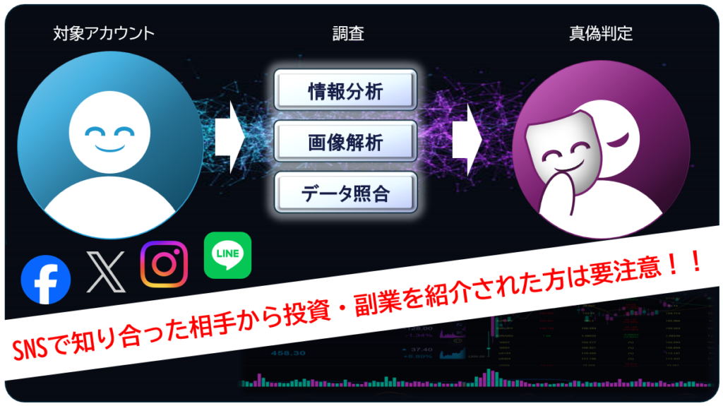 そのため、本サービスではSNSにアップされている内容や投稿画像を元に画像解析や情報分析、データ照合によりアカウントの真偽を判定し、すでに投資や副業の勧誘を受けている場合にはその実態調査も行います。