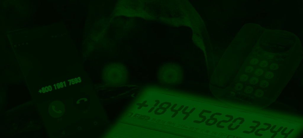 国際電話番号による詐欺の電話(アポ電)は2023年7月以降、急激に件数が増加し始め、同年9月にはそれまで主流であった「050IP電話」番号を超え、2024年度上半期時点における国際電話番号の比率は62.0%※を占めており、最近では「+1844」や「+800」などの国際フリーダイヤルの番号も目立つようになりました。