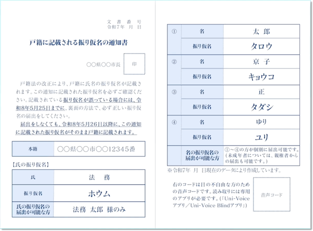 今月26日に施行された改正戸籍法により、来年(令和8年)5月26日以降、戸籍に記載される氏名へフリガナが記載されるのに伴い、順次、本籍地の市区町村長から戸籍の筆頭者宛に、「戸籍に記載される予定の振り仮名の通知書」が郵送されます。