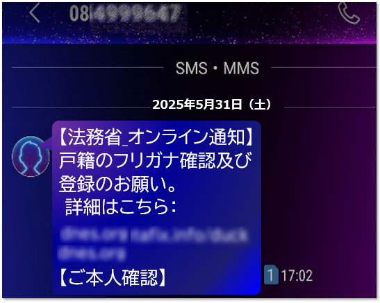 メールやSMSに法務省を装って通知し、登録手続きや本人確認と称して、マイナポータルや法務省の偽サイトへ誘導し、マイナンバーや家族構成といった個人情報のほか、クレジットカード情報を入力させる。