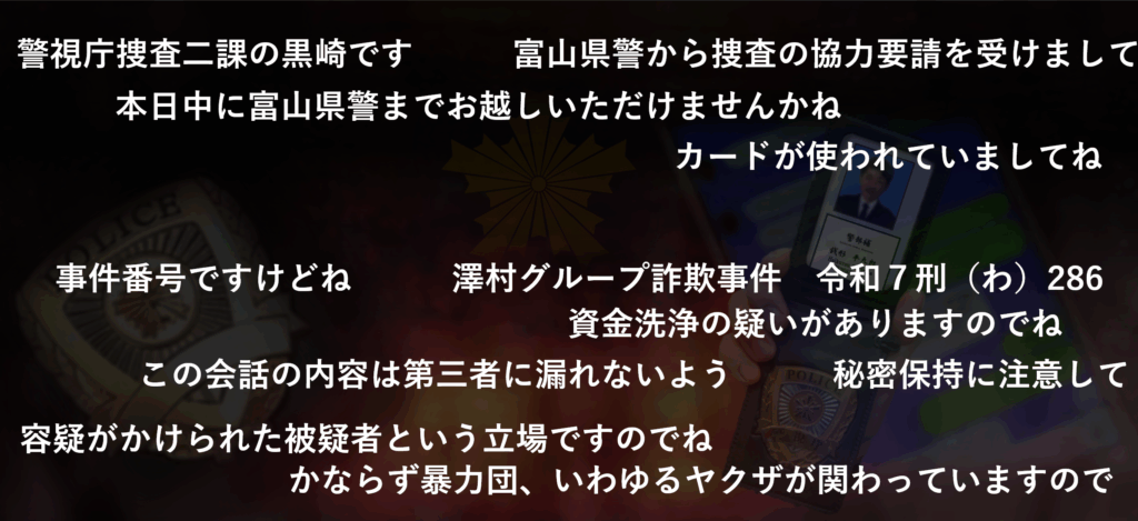 《澤村グループ詐欺事件》と称する手口においても、警視庁捜査二課をかたる者から「富山県警から捜査の協力要請を受けている」「富山で発生した詐欺事件で押収したカードの中にあなたのカードがあった」「本日中に富山県警まで出頭してもらう必要がある」などと告げてきます。